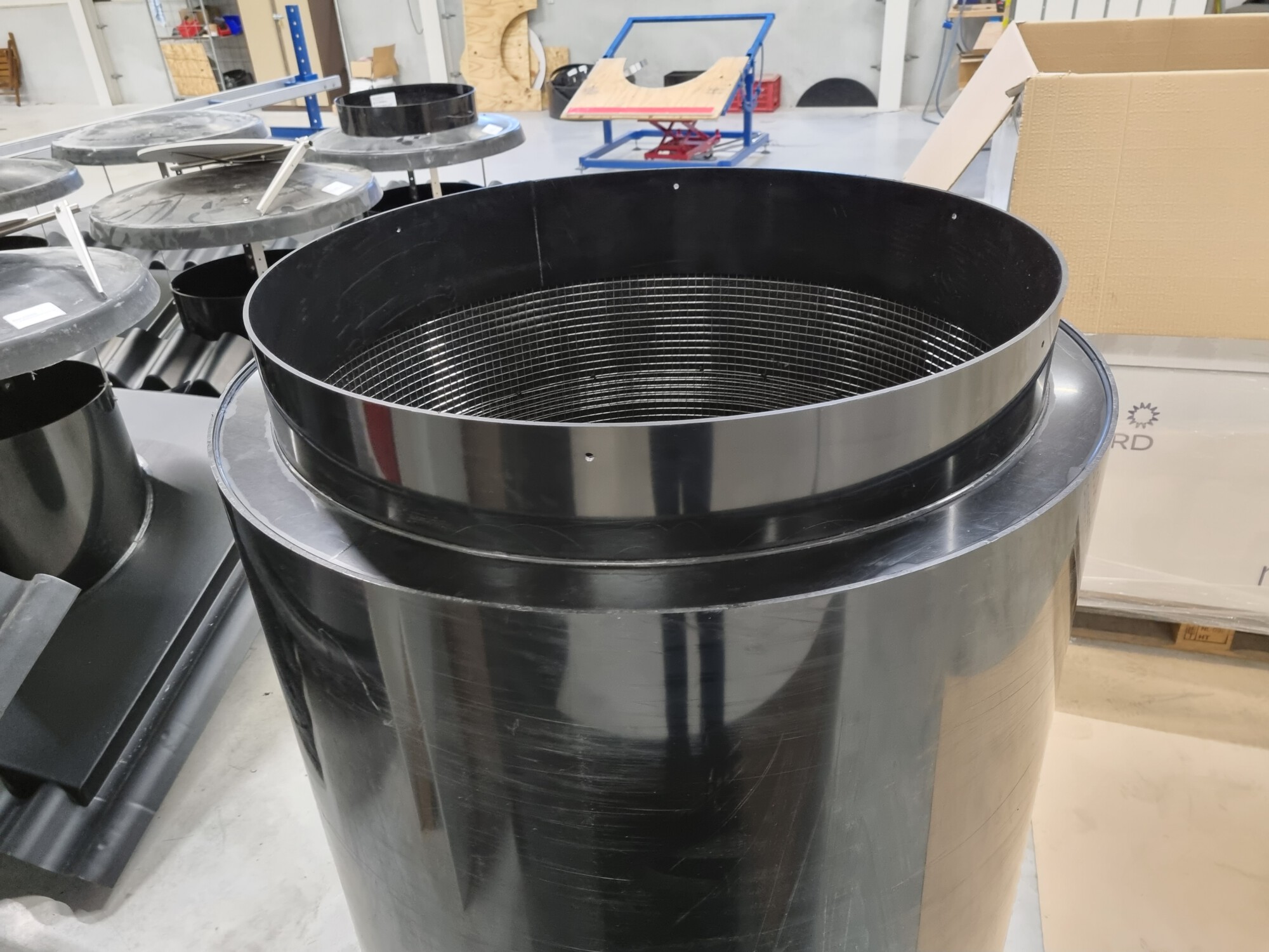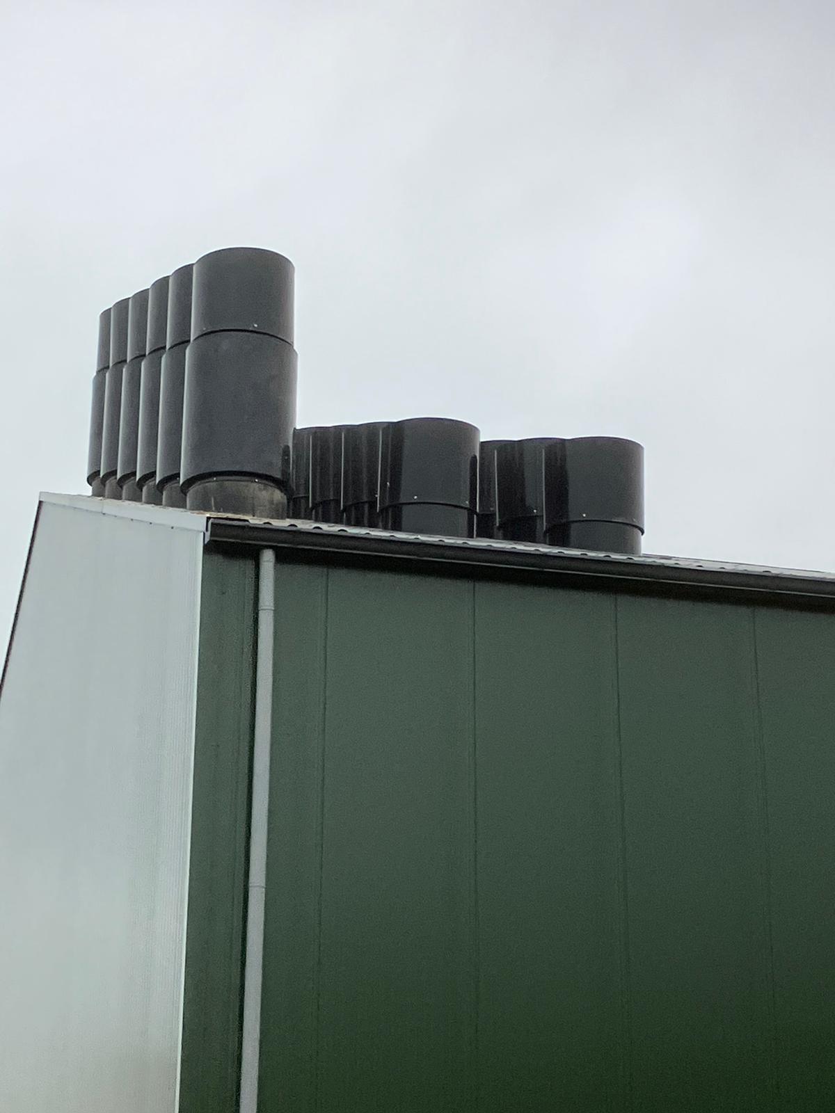 We had the opportunity to produce several exhaust chimneys with a silencer for a poultry house. Due to regulations, silencers are required to reduce the noise from the fans in the exhaust chimneys. The silencers are equipped with dirt and moisture repellent damping foam for a long service life.