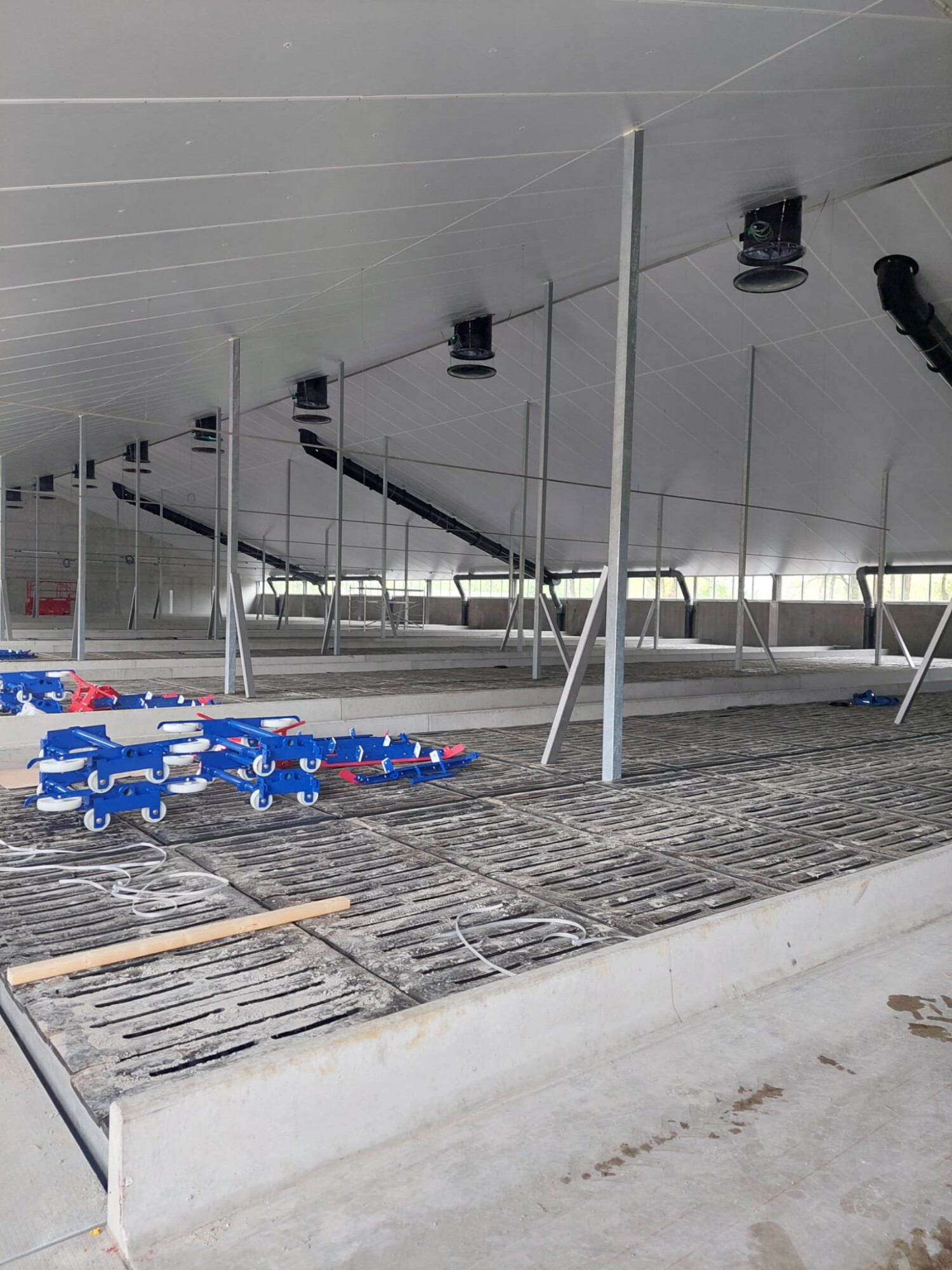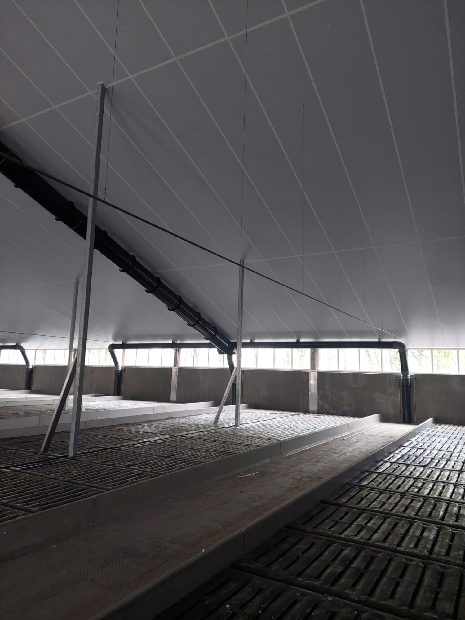 In a calf barn housing approximately 880 veal calves, we had the privilege of supplying the ventilation system. For ventilation, the first part of the air is extracted through the pit, effectively removing as much dirty air as possible before it reaches the animals. The remaining part of the ventilation is provided through roof chimneys equipped with fans with automatic measuring and throttling units, along with drip trays.